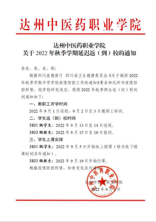 关于2022年秋季学期延迟返(到)校的通知