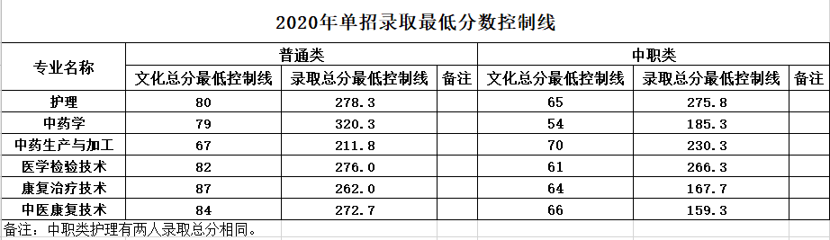 2020年单招录取最低控制分数线